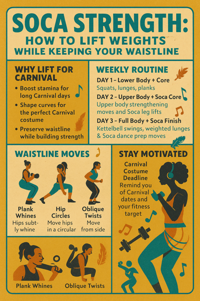 This is your guide to Soca Strength—a training method that blends resistance workouts with waistline-preserving core training and rhythm. Whether you’re dancing in Dominica or power whining in Port of Spain, this guide will help you build strength without losing that signature Carnival waistline flow.