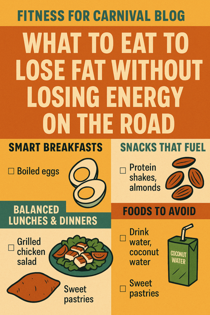 Losing fat while staying energized during Carnival prep or on the road is not about starving yourself. It’s about smart eating. Choose nutrient-dense, portable foods that keep your metabolism running, your energy high, and your Carnival bod getting leaner every week.